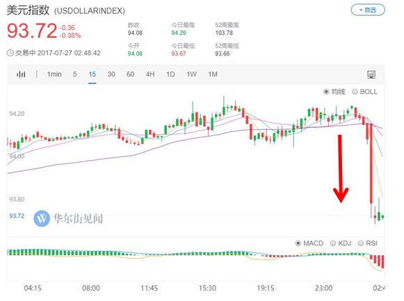 美元指数迅速回落0.4%,跌破94点关口。欧元兑美元涨幅扩大至61点或0.5%,刷新日高至1.1707,逼近周二所创2015年8月以来最高1.1712。美元兑日元下滑61点,最低触及111.56,日内跌超0.2%。现货黄金短线上扬6.60美元至日高1255.39美元/盎司,涨幅扩大至0.4%。